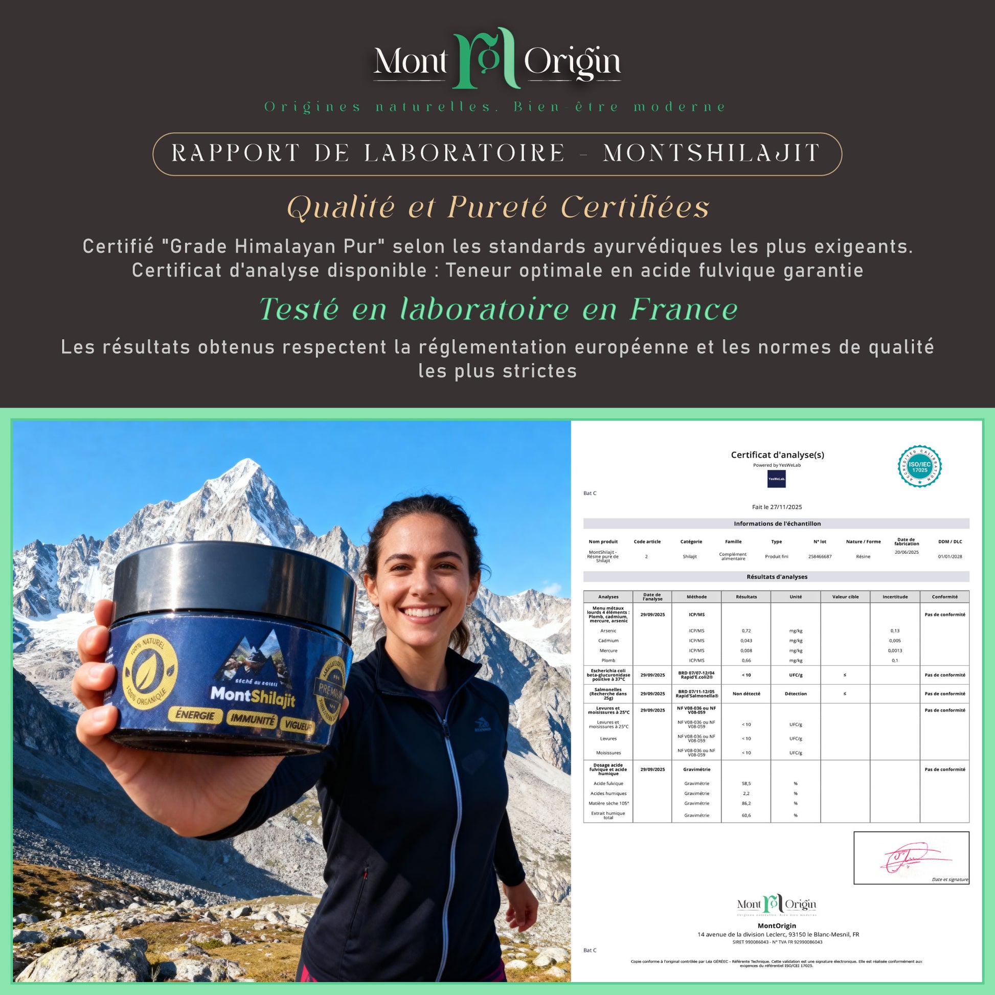 Oui, systématiquement. Chaque lot de notre Shilajit est analysé par notre laboratoire partenaire YesWeLab en France. Les tests vérifient la pureté, la teneur en acide fulvique et l'absence de métaux lourds, conformément aux normes européennes les plus strictes.